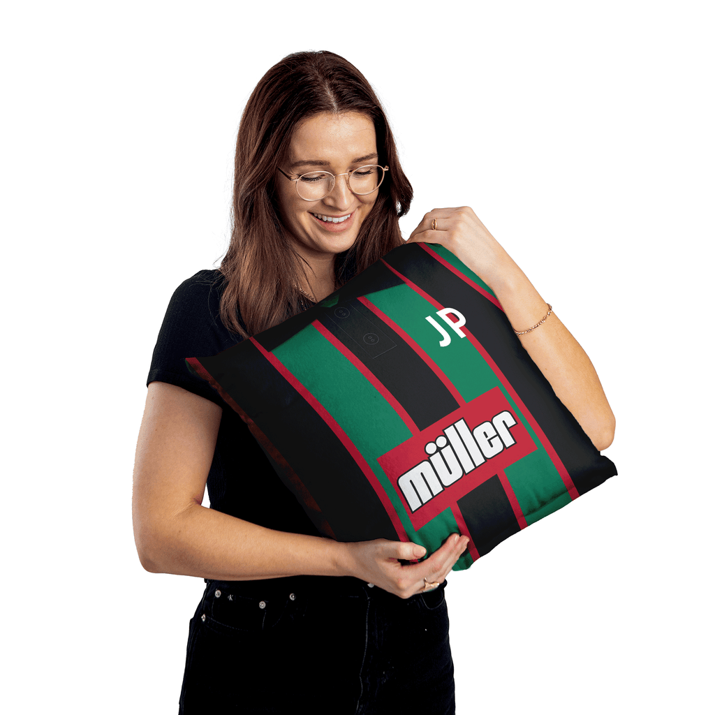 Be a part of the team with this high quality, personalised retro shirt square cushion with removable cover and zip.