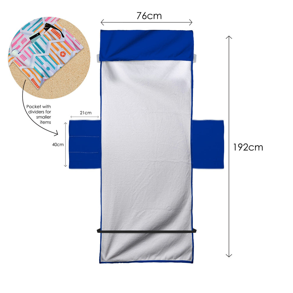 Our sun lounger towel is generously sized to fit most standard sun loungers perfectly. With dimensions of 192cm x 76cm, plus an additional 25cm in length that folds over the top of your lounger to keep it in place.