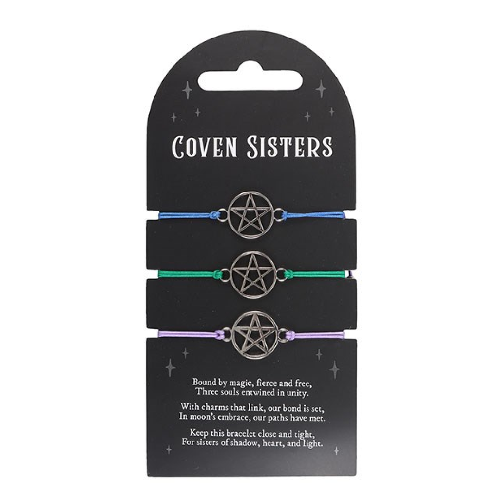 Celebrate sisterhood and shared magic with this set of 3 Coven Sisters string bracelets, each featuring a metal pentagram charm in coordinating blue, green, and purple tones. With adjustable sizing for the perfect fit, these bracelets make a thoughtful gift for witchy besties and spiritual soulmates alike. Presented on a matching backing card for easy gifting. May contain traces of nickel and is made from alloy in accordance to REACH specification.