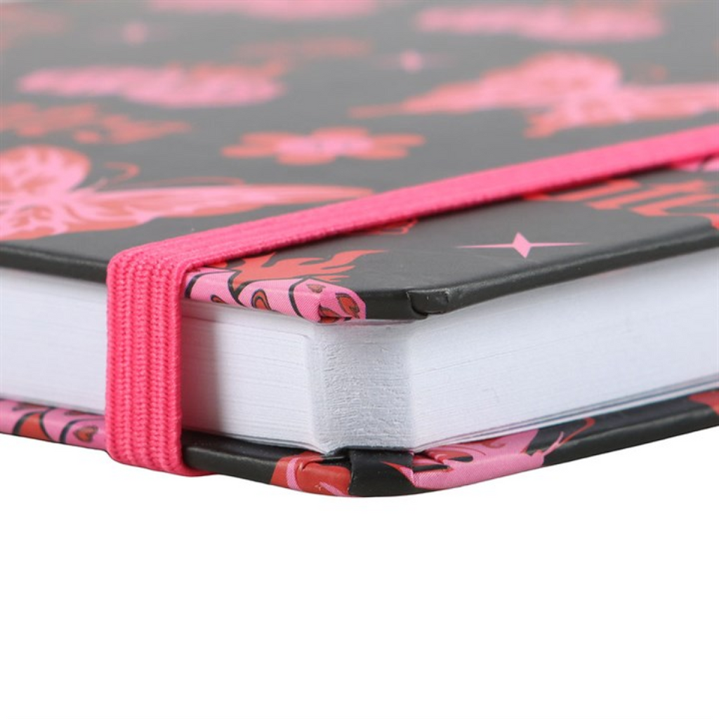 Make note-taking a little bit rebellious with this A5 notebook featuring a bold all-over print of Y2K-inspired butterflies, dice and alt-style icons in hot pink and red. With 100 sheets / 200 lined pages, it's perfect for journaling, sketching ideas or fuelling your pop-punk daydreams.
