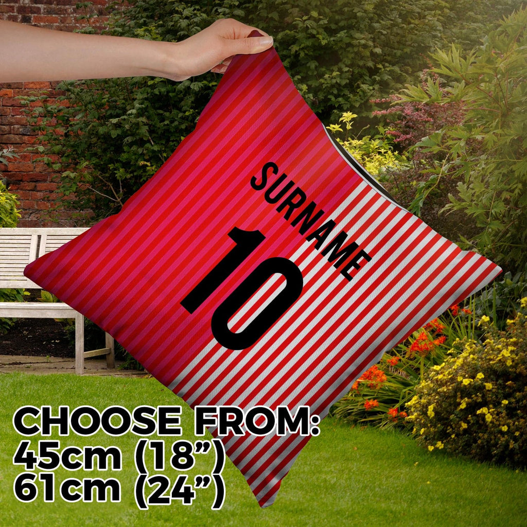 Be a part of the team with this personalised showerproof retro shirt square cushion with removable cover and zip. Suitable for outdoor use.